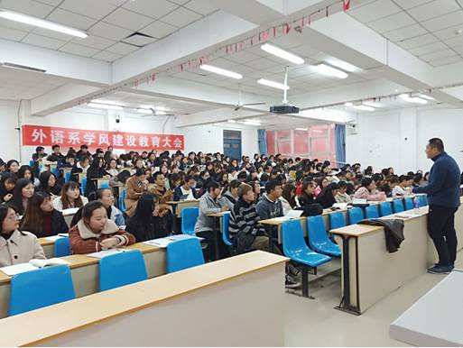 为了扎实推进外语系学风建设工作,努力提高人才培养质量,营造积极向上的学习氛围,2018年11月29日下午,我系于公教楼C408教室召开学风教育大会。本次会议由外语系主任普昆主讲,大一、大二、大三全体学生参加了此次会议。