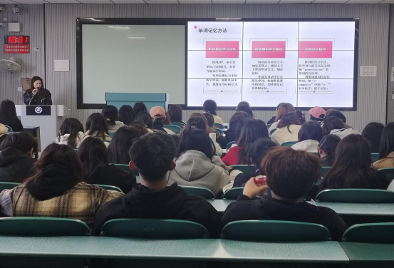 活动伊始,商务英语教研室教师闫如玉结合教学经验,从“输入-内化-输出”三阶段解析语言学习规律。她建议同学们通过外刊阅读、影视配音、跨文化交际实践等途径提升语言应用能力,并推荐了“经济学人”“TED演讲”等优质学习资源。同时,她聚焦“翻译思维培养”,强调“双语逻辑转换”与“文化背景储备”的重要性,现场演示了如何利用语料库工具提升翻译精准度,引发学生热烈讨论。