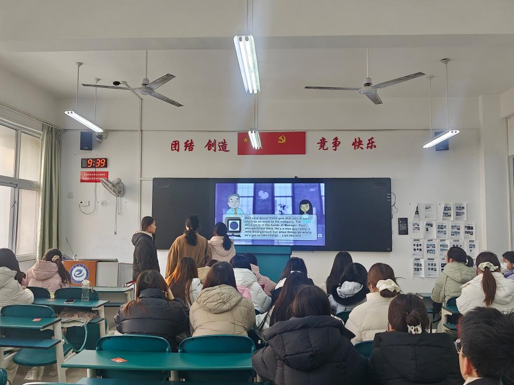 活动中,各班级立足学生学习需求设计特色内容,形成百花齐放的活动格局。有的班级以“英语角色即兴扮演”为核心,将商务谈判、日常沟通等真实场景转化为表演素材,各组随机抽取主题即兴完成英语对话演绎,同学们反应机敏、表达生动,在互动中锤炼口语表达与临场应变能力,现场氛围热烈融洽;有的班级聚焦“商务英语词汇语境化学习”,精选融合专业词汇的经典影视片段,采用“小组接力复述”形式,既考验听力记忆功底,又让学生在台词还原中深化对专业词汇实际用法的理解,实现“听力+词汇+理解”的多维提升;还有的班级以“英语词语接龙”为竞技载体,设置“尾字母为首字母”的接龙规则与限时挑战环节,通过紧张激烈的赛制充分调动学生参与热情,在快速检索词汇、默契协作接龙的过程中,激活词汇储备潜能,凝聚班级向心力。