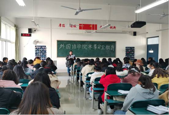2019年12月5日下午,外国语学院冬季安全教育大会在工科组团422举行,全院各年级主要学生干部、大一全体同学参加了会议。会议由辅导员张婷及班主任付余佩主持。