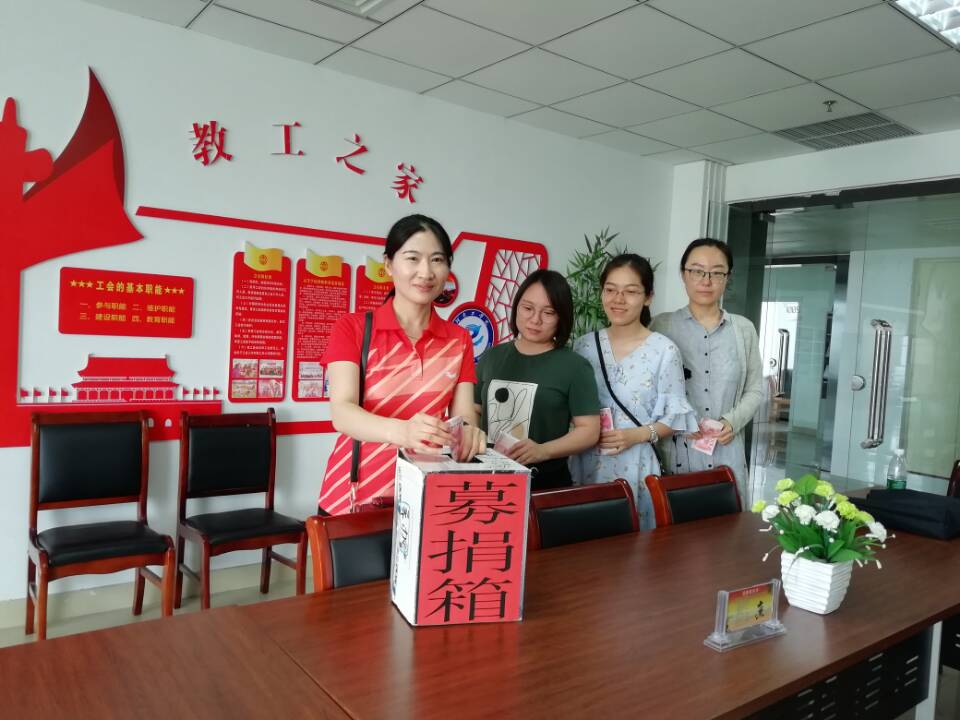 2019年7月4日,外语学院分工会在院党总支组织下举行了为我校理学部教师郑亚辉老师爱心捐款的活动。在捐款中,我500元、你200元、他100元,从学院党员干部到非党员教工,全体教师人人慷慨解囊,纷纷献出爱心,共计捐款3800元。外语学院分工会委托校工会及时将凝聚着全院党员干部、教师的3800元爱心捐款送到意外严重烧伤患病同事的手中,解决他的实际困难,以帮助他渡过难关,使身患疾病的他及他的家人早日康复,健康快乐生活工作。