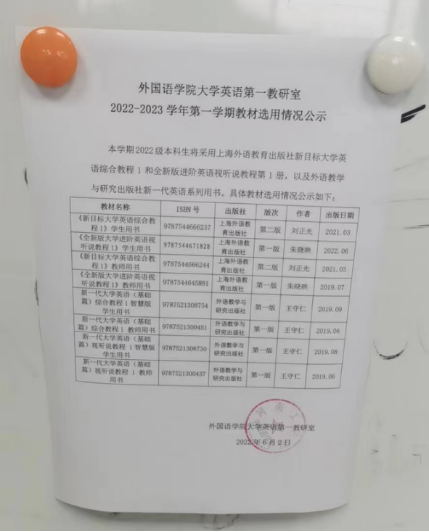 根据学校教材选用管理办法,扎实推进教材选用工作的科学化、制度化和规范化,2022年6月1日,大学英语第一教研室在创新楼1018室召开2022-2023年度秋季学期教材审核会。会议由教研室主任靳静波主持,外国语学院党总支书记张红兵、院长普昆、副院长冯宜丽和本教研室教师代表参加,会上就下学期拟征订的教材进行逐个审核。
