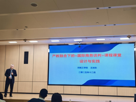 专题研讨环节以“人工智能背景下的商务英语专业建设与课程改革”为核心,就课程改革、人才培养、产教融合、师资建设、数智赋能等议题分享实战经验,为一线教学提供了可操作方案。我院副院长王旭东受邀在此环节率先发言,探讨了产教融合下的《国际商务谈判》课程设计,强调以实战案例深化校企合作。王院长的发言反响热烈,引起了参会人员的积极讨论。