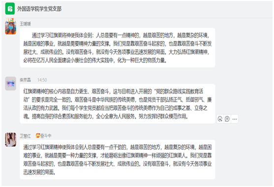 与会同志纷纷表示,要进一步弘扬红旗渠精神,赓续红色血脉,不断增强本支部的组织力、凝聚力、战斗力,以更好发挥支部共产党员先锋模范作用。支部要把红旗渠精神转化为担当作为、矢志奋斗的精气神,凝心聚力推动学校本科教学工作合格评估和省示范校建设,以高质量党建推动学校事业高质量发展。(外国语学院学生党支部 文/图)