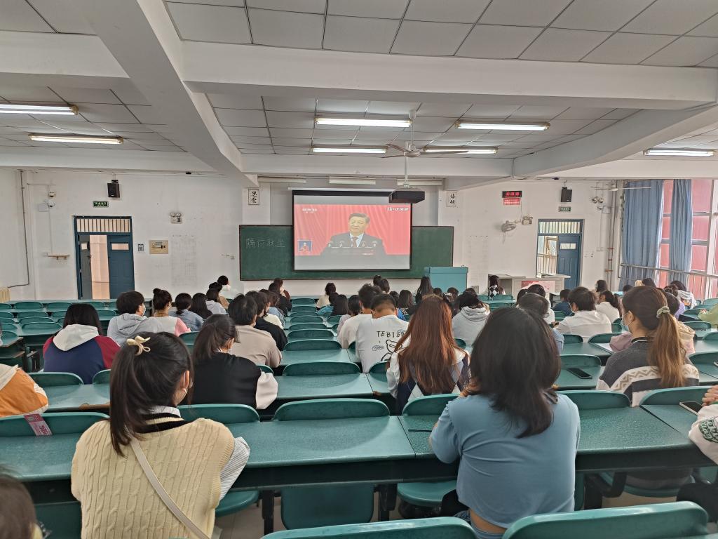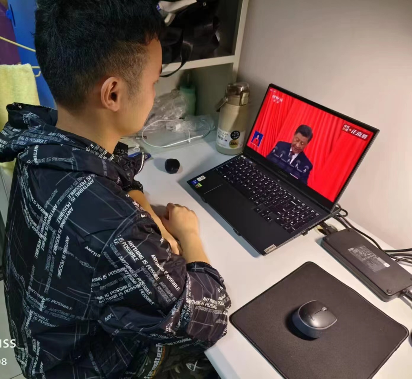 外国语学院全体学生干部、团员以支部或寝室为单位分散在自习室、教室、寝室等地,也收听收看了二十大开幕会。(外国语学院学生党支部 文/图)