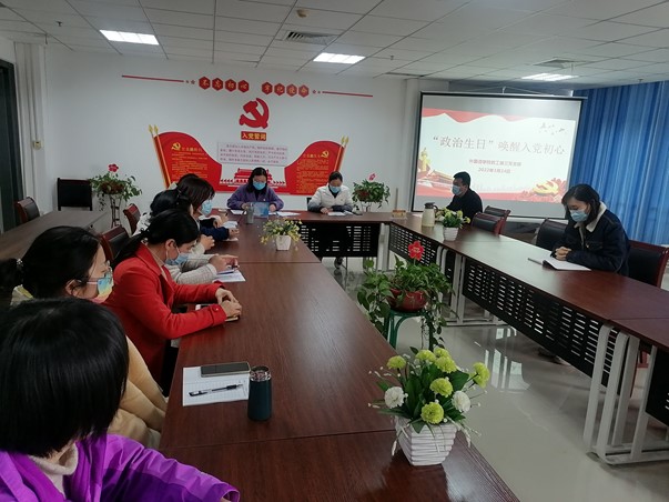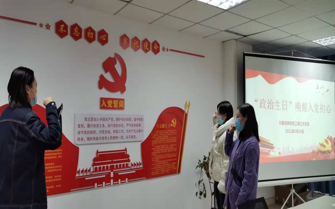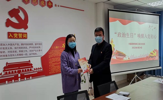 为强化党员的身份意识、责任意识和宗旨意识,2022年3月24日下午,外国语学院教工第三党支部在创新楼1012开展了以“‘政治生日’唤醒入党初心”为主题的党日活动,为3月份加入中国共产党的2名党员庆祝“政治生日”。本次活动由支部宣传委员袁瑞姣主持,外国语学院党总支书记张红兵同志和支部全体党员参加。