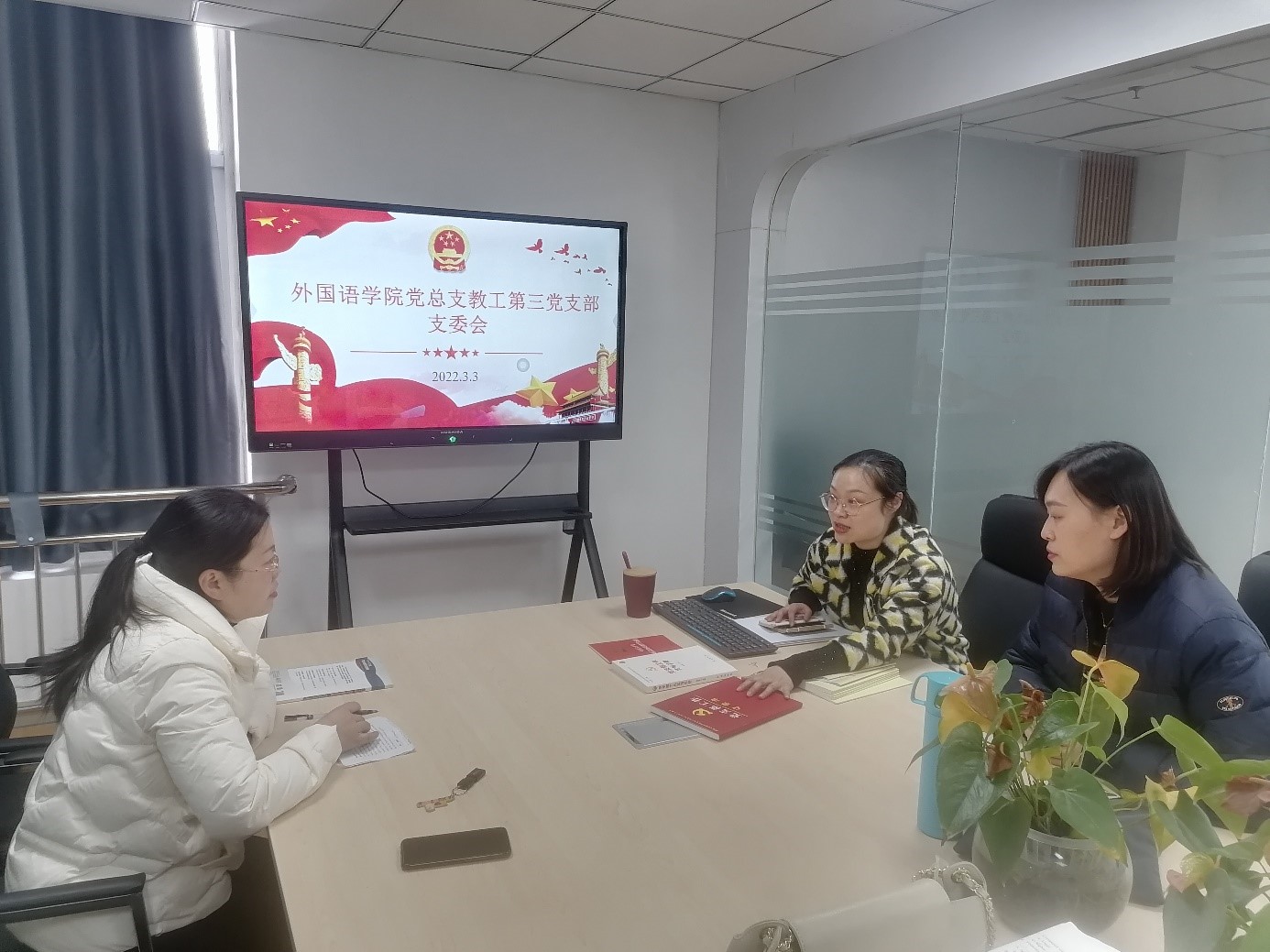 3月3日下午,外国语学院教工第三党支部召开支部委员会,积极推进支部组织生活会和民主评议党员工作的开展。会上,支部书记韩慧带领大家认真学习了学校《关于做好2021年度基层党组织组织生活会和民主评议党员有关工作的通知》要求,并对开展组织生活会前的集中学习研讨、谈心谈话、广泛征求意见、查摆问题、批评与自我批评、民主评议党员等重点环节进行了安排部署。