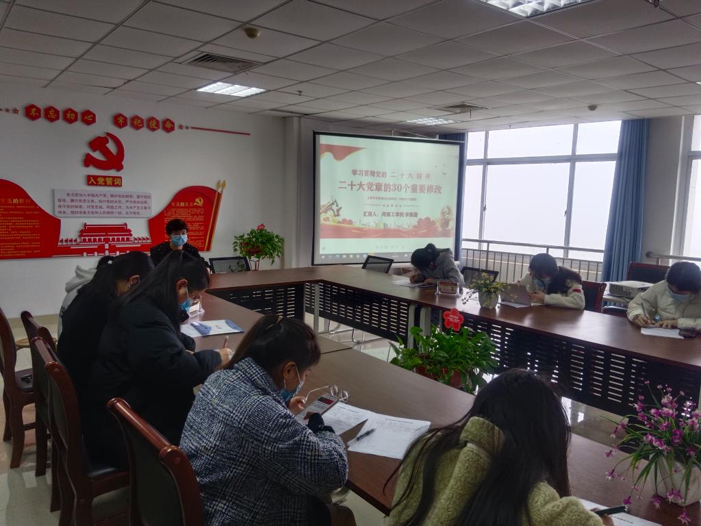 会上,李佩珊围绕“二十大党章的30个重要修改”,分别阐述了党的二十大为什么要修改党章、党的二十大关于党章(修正案)决议、二十大党章的30个重要修改等主要内容,指出修改党章是深入学习贯彻党的创新理论的需要,是推进党和国家事业发展的需要,是深入推进新时代党的建设新的伟大工程的需要,是贯彻落实党的二十大精神的需要。通过宣讲,同学们深刻体会到党的二十大的重大意义、更加深刻领会了精神实质、更加明确了努力方向。