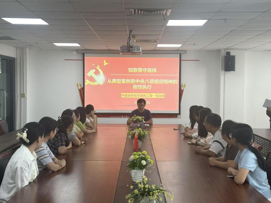 为深入推进全面从严治党,加强教职工廉洁自律意识,7月5日外国语学院教工第一党支部书记陈修铭在党课中以“知敬畏,守底线”为主题,结合典型案例,生动讲述了中央八项规定的刚性执行情况。此次党课旨在引导广大教职工树立底线思维,践行廉洁从教。