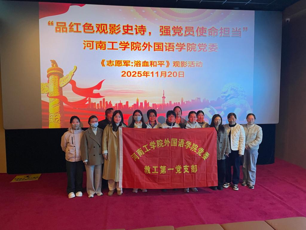 为深入开展学习贯彻习近平新时代中国特色社会主义思想主题教育,缅怀革命先烈,传承红色基因,激发党员教师的爱国热情和奋斗精神,11月20日下午,外国语学院教工第一党支部组织全体党员教师集体观看了爱国主义教育影片《志愿军:浴血和平》。