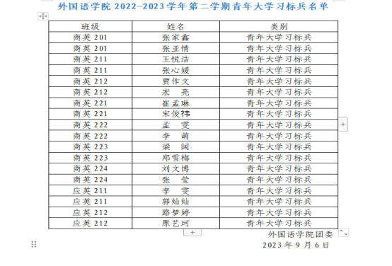为响应团中央关于“青年大学习”的行动号召,鼓励青年大学生积极学习先进思想、强化思想政治引领,进一步推动“青年大学习”取得新成效,外国语学院团委近日开展“青年大学习标兵”评定工作,评选出2022-2023学年第二学期“青年大学习标兵”18人。