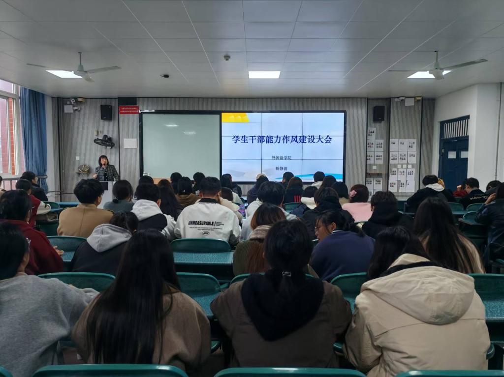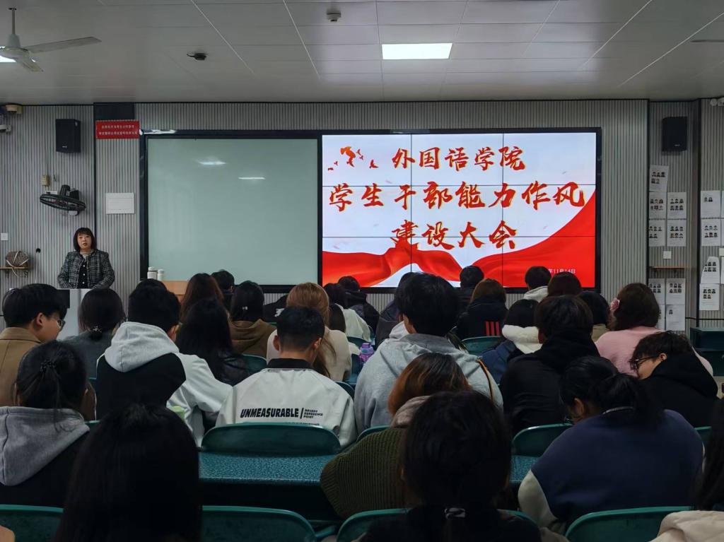 为加强学生干部队伍建设,提升学生干部的综合能力与作风水平,11月14日下午,外国语学院召开了学生干部能力作风建设大会。本次大会旨在培养更具责任感、领导力和执行力的学生干部团队,为学院的发展和学生工作的顺利开展奠定坚实基础。