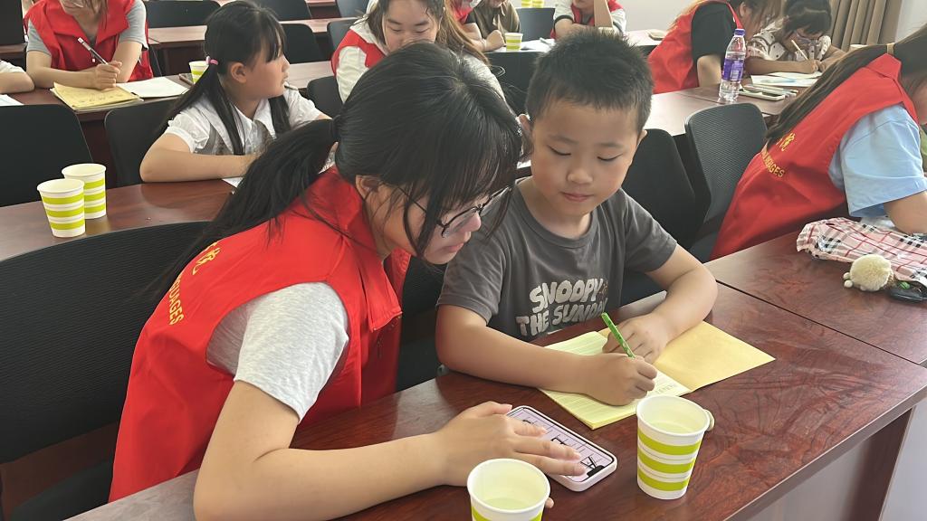 夏日的天空湛蓝如宝石,白云悠悠飘荡,似棉花糖般轻盈。志愿者们如约来到华恩社区,在社区明亮且安静的房间里,开始了一对一的英语辅导。志愿者们专注地引导着小朋友们进行英语学习,清晰而缓慢地发音,引导孩子们跟读。小朋友们聆听着志愿者们的讲解,认真地在笔记本上记录要点。一对一辅导结束后,志愿者和小朋友们一起观看英语电影。小朋友们整齐地坐着,眼睛紧紧盯着屏幕,跟读英文台词,脸上的表情随着电影中的情节发展而变化。