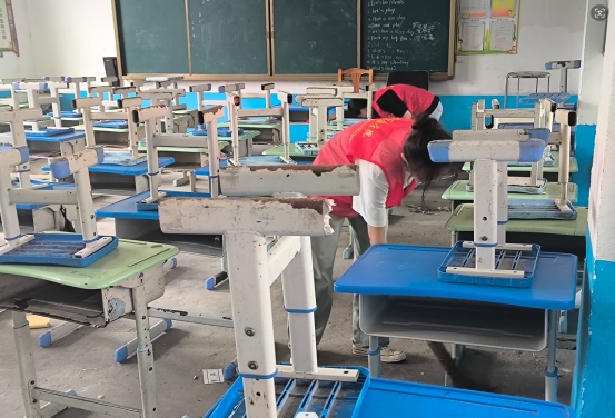 经过5个小时的颠簸,团队终于抵达晏庙小学,第一项重要任务便是布置教室。大学生们充分发挥创意和团队协作精神,将一间间朴素的教室装点得温馨而充满活力。他们张贴了色彩鲜艳的画报,摆放了整齐的桌椅,为孩子们营造出一个舒适、愉悦的学习环境。