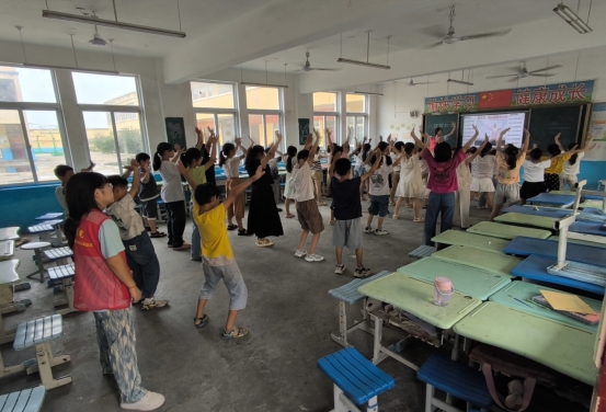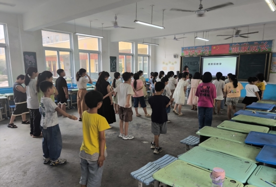 健美操以其活力四射的节奏和动感的步伐深受孩子们喜爱。在学习健美操的基本步伐时,支教队员耐心地分解每一个动作,孩子们认真模仿,跟随音乐的节奏尽情舞动,展现出青春的活力与朝气。