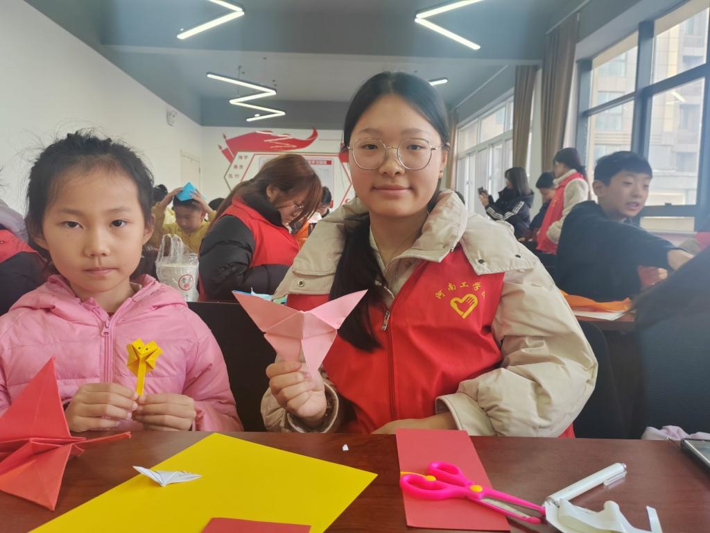 完成作业辅导后,备受期待的折纸活动正式拉开帷幕。志愿者们向孩子们展示了各种精美的折纸作品,瞬间吸引了他们的目光,激发起强烈的好奇心与参与欲望。在志愿者们的悉心示范与手把手指导下,孩子们纷纷拿起彩色纸张,尝试折出自己心仪的作品。从简单的纸飞机、小船,到较为复杂的千纸鹤、花朵等,活动现场充满了欢声笑语。折纸过程不仅锻炼了孩子们的动手能力与手眼协调能力,还培养了他们的专注力与耐心,让他们在创造美的过程中收获了满满的成就感与快乐。