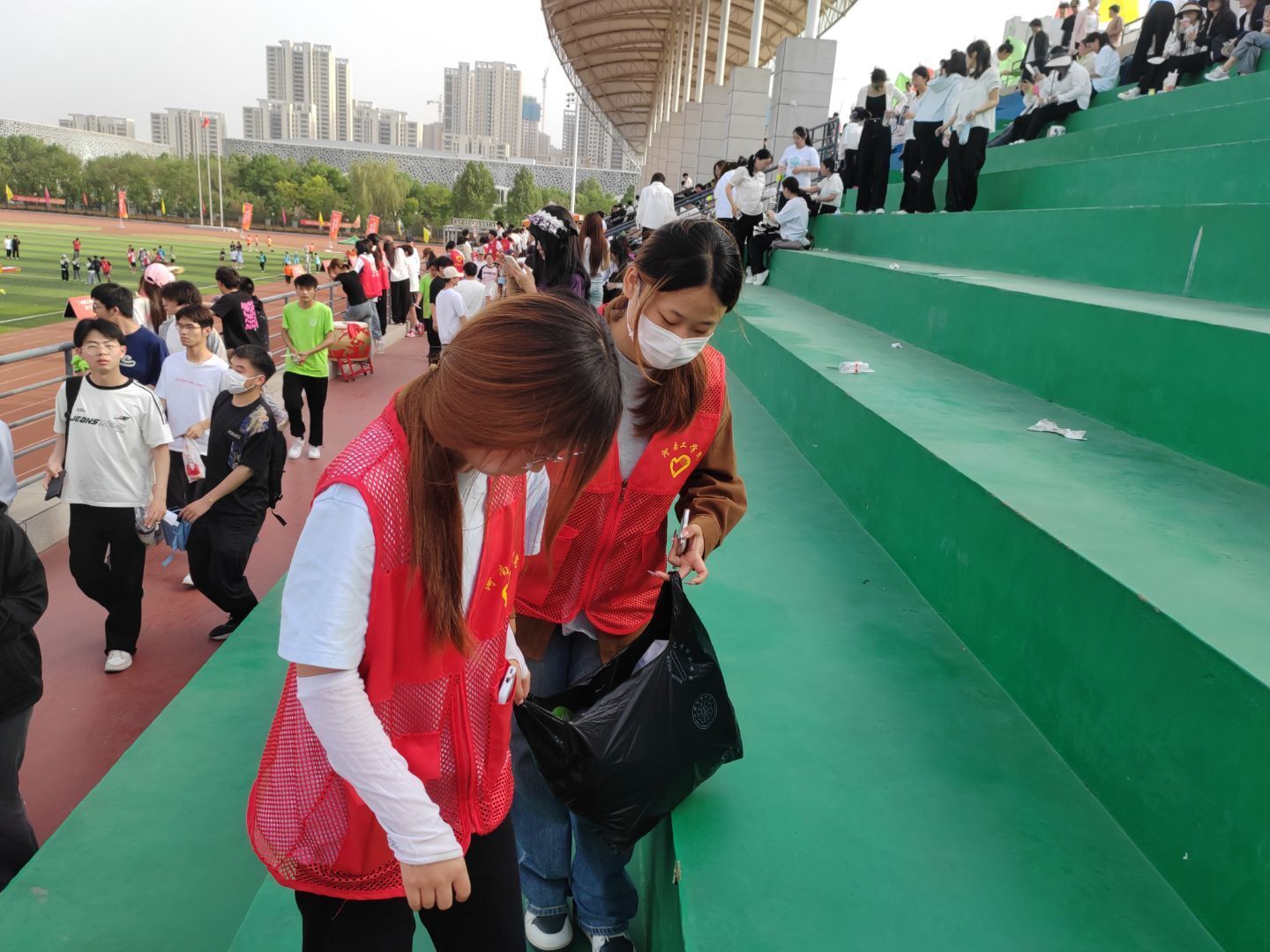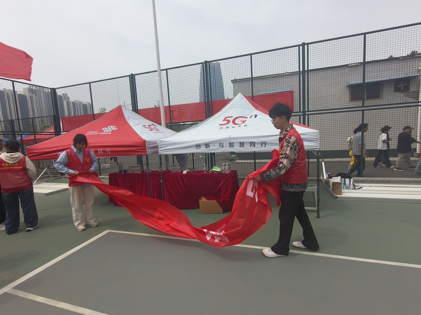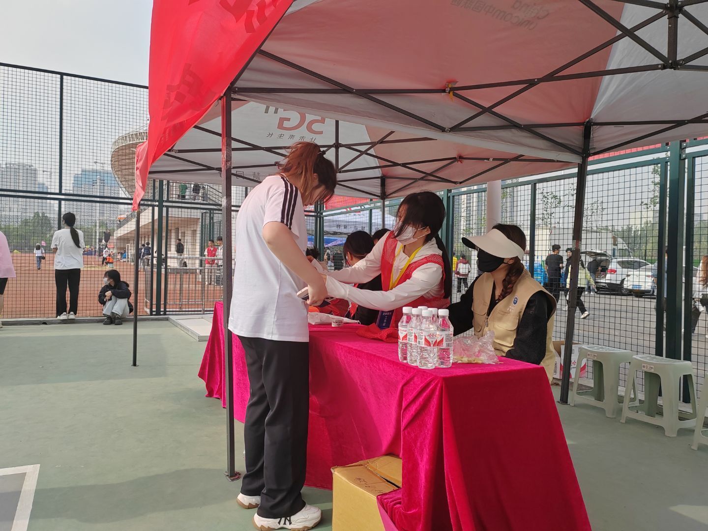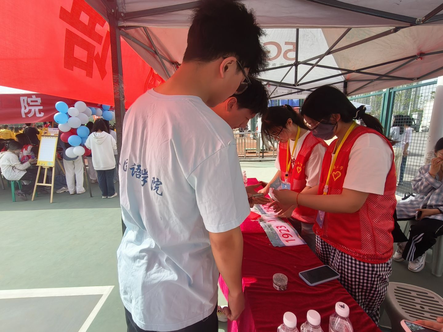 在活动现场,志愿者们分工明确、各司其职,构筑起活动顺利开展的坚实后盾。场地布置组的志愿者们化身“空间规划师”,他们有条不紊地布置学院服务台,将活动条幅拉直抚平,将桌椅摆成整齐的直线,在急救箱贴上显眼的红色十字标识,稳稳置于服务台医疗区的中央。赛事引导组的志愿者们化身贴心“护航员”,他们指尖轻捏号码布边缘,小心翼翼地为运动员们贴在胸前,“记得10点15分去检录处排队哦,沿着这条蓝线直走就能看到指示牌。”他们一边轻声提醒检录时间与路线,一边伸手为运动员理顺被风吹乱的衣角,最后总会捎带一句“加油,你一定能发挥得很棒!”这些藏在细节里的关怀,让紧张的赛前准备也染上了温暖的底色。看台秩序组的志愿者则化身“文明守护者”,他们穿梭于观众席间,提醒观众有序就坐、文明观赛。志愿者们还手持垃圾袋,清理观众遗落的纸屑、空瓶等。正是有了志愿者们的全情投入,才让“志愿红”成为活动现场最温暖的底色,为赛事的每一个环节织就了一张张细密而可靠的保障网。