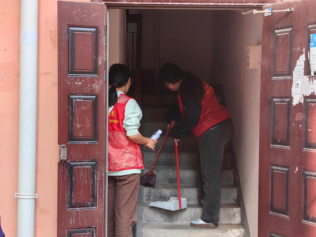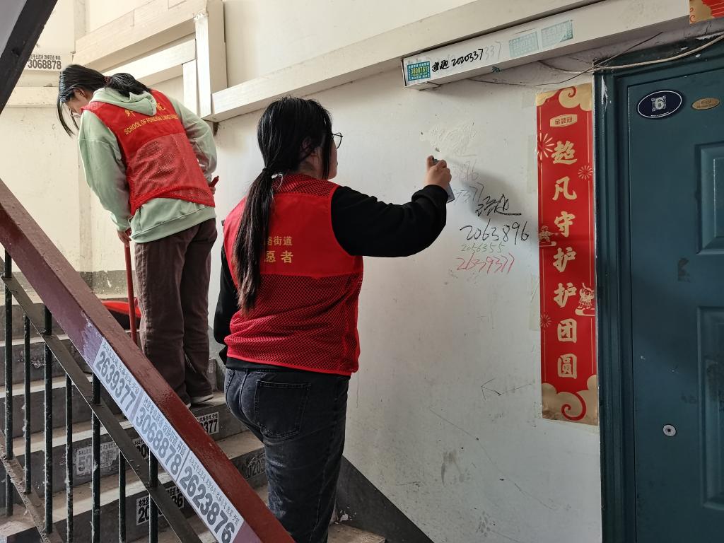 上午九点,志愿者们抵达健北社区,迅速分为两组投入工作。第一组和社区人员一起手持劳动工具,对社区楼道内积存的蜘蛛网、烟蒂、塑料垃圾展开“地毯式”清理。他们弯着腰、低着头,仔细地清理每一处卫生死角,甚至徒手将卡在缝隙里的纸屑抠出。遇到乱摆乱放的单车,大家细心摆好,即使汗水浸透了衣衫,也依然干劲十足。经过一番努力,原本略显杂乱的楼道焕然一新,道路干净整洁,绿植生机勃勃。第二组志愿者穿梭在社区的各个楼道间,专注于清理小广告工作。楼道里小广告随意张贴的现象较为严重,墙面上、楼道扶手,密密麻麻层层叠叠。志愿者们两人配合默契,先拿起铲刀,一点点将小广告从墙面铲除,遇到粘贴牢固难以清理的,就用喷漆覆盖小广告,并耐心等待片刻后再清理。每清理完一处,都仔细检查是否还有残留。过程中,汗水不断从额头冒出,浸湿了衣衫,他们也顾不上擦拭。在志愿者的努力下,原本布满杂乱小广告的楼道变得清爽干净,整洁的楼道成为社区文明的新窗口。