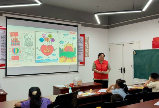 正值建党节,红色教育成为当天活动的重要主题。实践队员向孩子们普及建党节知识,用生动的语言讲解中国共产党的建设与发展历程,从中共一大召开的红船故事到新时代的伟大成就,帮助孩子们了解党的历史脉络。在手绘活动中,孩子们拿起画笔,在画纸上绘制党徽、红旗、天安门、中国地图等元素,用稚嫩的笔触表达对党的祝福。随后,队员们带领孩子们学唱《没有共产党就没有新中国》等经典红歌,激昂的旋律回荡在活动现场。活动最后,大家共同观看了党建主题微电影,通过鲜活的影像故事,让孩子们进一步理解党的初心与使命。