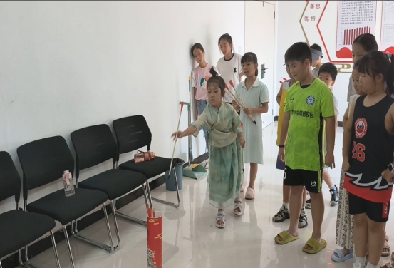 书法课堂上,志愿者从“文房四宝”讲起,示范毛笔使用技巧,孩子们在单字练习中感受“字如其人”的内涵。午后趣味运动会中,传统投壶、传递乒乓球、夹玻璃珠等项目,锻炼专注力、协作力与耐心。活动尾声,荣誉卡片定格孩子们收获满满的笑脸。