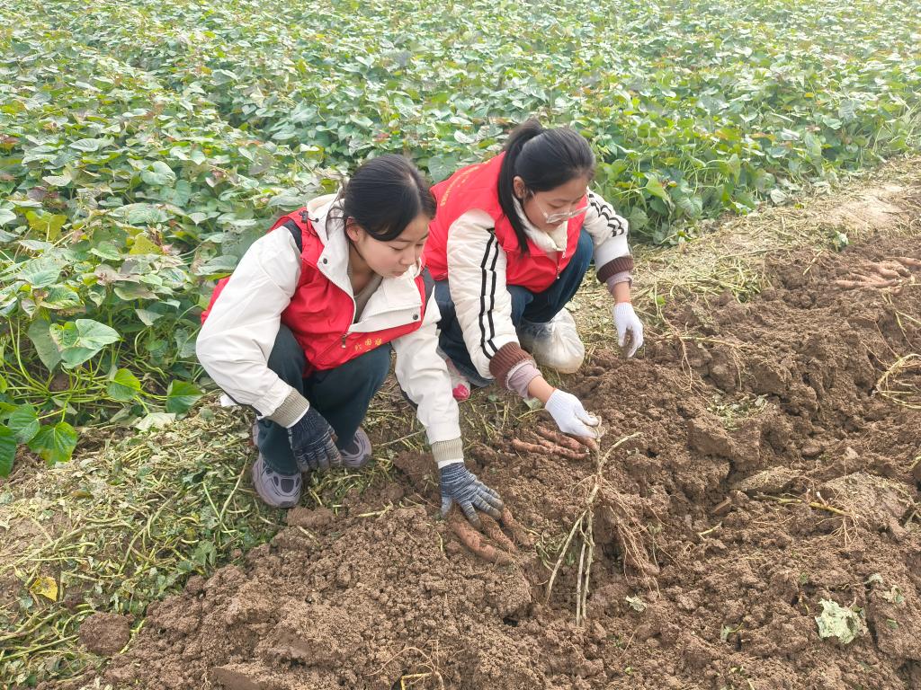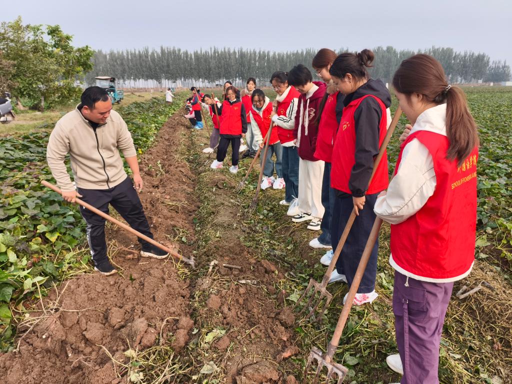活动当天,同学们乘坐大巴车集体前往农场,将“劳动必修课”搬进丰收的田野,以亲身耕耘践行劳动育人理念。开场之际,农场师傅结合秋季农事特点,细致讲解作物成熟判断标准,红薯挖掘等技能的安全要点与实操技巧。示范结束后,志愿者们迅速分组投入劳作,薯地里,大家用小铲子小心拨开泥土,一颗颗饱满的红薯破土而出,田间满是惊喜欢呼。汗水浸湿衣衫,劳作声与笑声交织,汇成秋日田野里最生动的画面。劳动间隙的“田埂分享会”上,土地负责人结合自身经历,分享农耕智慧,以及现代农业科技赋能粮食生产的故事,让劳动的意义在交流中愈发清晰。辛勤劳作后,农场师傅烤起大家挖的红薯,香甜气逐渐漫开,志愿者们剥开焦皮,咬下热乎薯肉,眉眼弯起:“自己挖的就是甜!”。活动结束,志愿者们将亲手收获的红薯仔细打包,把沉甸甸的劳动成果转化为真切的获得感。