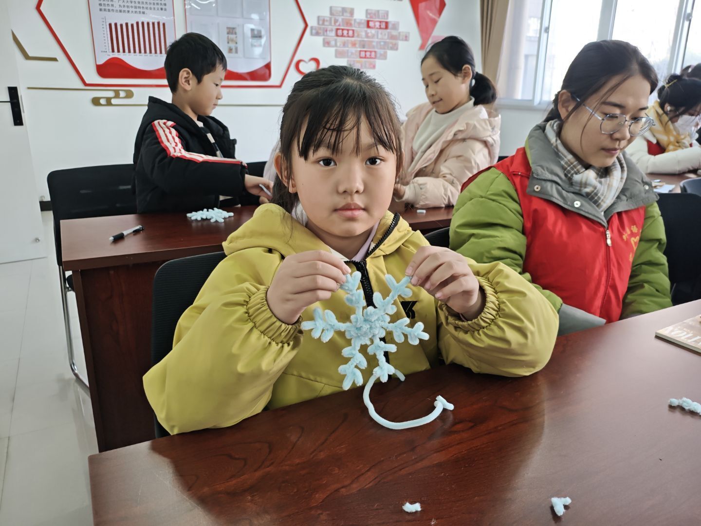 活动开始,志愿者们耐心地解答孩子们在学习中遇到的问题,辅导孩子们完成作业。随后,雪花扭扭棒制作环节正式开始。现场材料包丰富,除扭扭棒外,还备有柔软粘土与双面胶。志愿者详细讲解材料用法,特别提醒“粘土轻捏成型,撕双面胶时慢慢揭”,确保操作安全。制作中,志愿者先示范扭扭棒弯折、固定的核心技巧,做出雪花基本轮廓。接着引导孩子们用粘土点缀:有的揉白粘土小圆球粘在雪花“花瓣”末端当雪粒,有的捏浅蓝粘土星星;遇到粘土粘不牢时,便用双面胶辅助固定。孩子们全神贯注,遇问题时志愿者及时手把手指导,现场满是轻柔的创意交流声。最终,普通材料在孩子们手中变成立体精致的雪花作品,孩子们眼中满是惊喜与成就感。